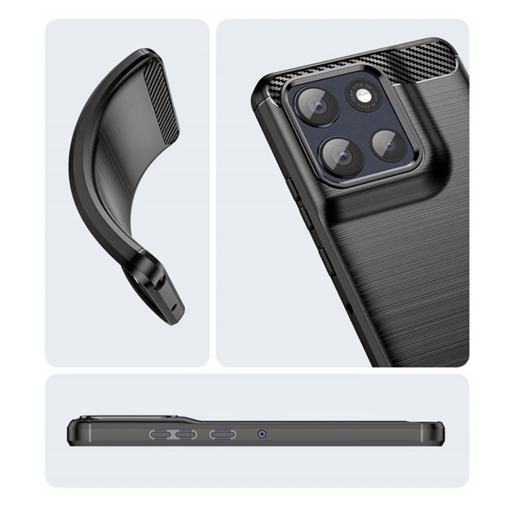 A tok kiváló minőségű szilikonból készült, mely rugalmas és rendkívül strapabíró, kiválóan elnyeli az ütéseket. A hátlap modern, szálcsiszolt fémhatású textúrát kapott, amely elegáns megjelenést kölcsönöz a telefonnak, miközben ellenáll az ujjlenyomatoknak és a kisebb karcolásoknak. A tok felső és alsó részén elhelyezett karbon mintázatú betétek nem csupán dizájnelemek, hanem fokozzák a fogást és extra sportos eleganciát biztosítanak. A letisztult fekete szín időtálló és minden stílushoz illik.