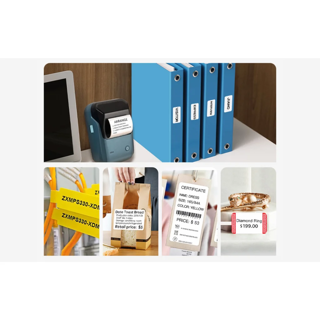 Az alkalmazás navigálása öröm. Csak néhány kattintás a képernyőn, és a címkéje készen áll. A hangfelismerés és a QR-kód szkennelés révén a Niimbot B1 használata még egyszerűbbé és intuitívabbá válik, különösen, ha nagyszabású nyomtatásra van szüksége. A nyomtató támogatja a 15-60 mm széles papírtekercseket, így akár széles, akár igen keskeny címkéket is nyomtathat, például ékszerekhez.