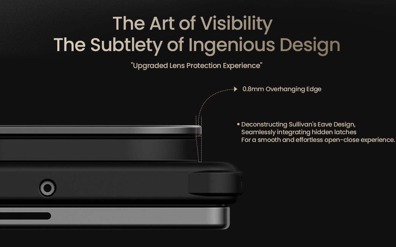 - Kijelző és zsanér védelem: Az előlapi keret 0.5 mm-rel megemelkedik, extra védelmet nyújtva a kijelzőnek a karcolásokkal szemben. A tok zsanérvédelmet is magában foglal, amely "Deconstructing Sullivan's Eave Design" és zökkenőmentesen integrált rejtett reteszek révén biztosítja a telefon könnyed és hibátlan nyitását és zárását.