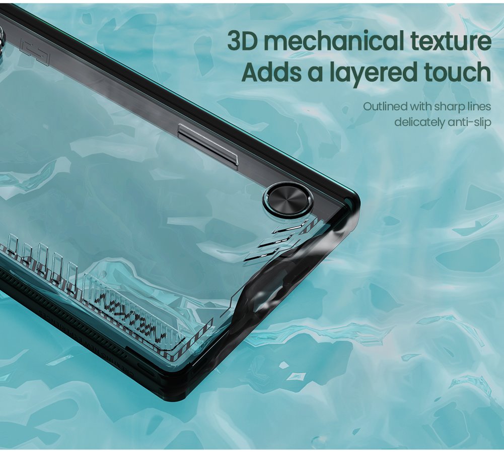 - Az oldalakon található 3D mechanikus textúra, éles vonalakkal kontúrozva, nemcsak modern és stílusos megjelenést kölcsönöz, hanem csúszásmentes fogást biztosít, minimalizálva a véletlen leejtések kockázatát.