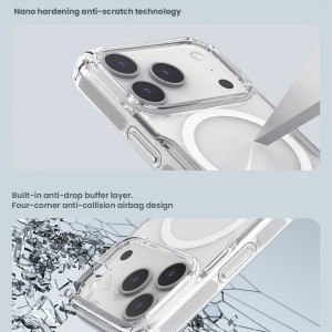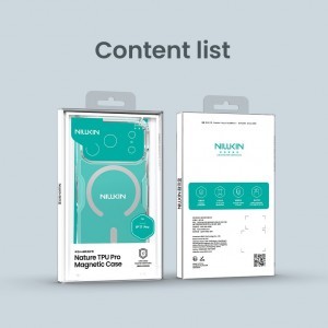 A Nillkin Nature TPU PRO Mágneses védőtok integrált mágnessel rendelkezik az Apple MagSafe kiegészítőkhöz. A klasszikus Nature TPU-hoz képest a tok mágnessel van felszerelve, és két PC/TPU anyag kombinációjából készült. Tartós és erős polikarbonát (PC) található a hátlapon, amely karcálló, és rugalmas TPU anyag a széleken. A tok PC része színtartó marad, és nem sárgul be, mint más tokok. Ennek a kombinációnak köszönhetően a legjobb védelmet nyújtja a telefonodnak. Megbízhatóan védi a karcolásoktól és a portól, de egy váratlan esés esetén is kiválóan helytáll. A tok vékony és átlátszó anyagból készült, ami kiemeli a telefon designját. Alacsony vastagsága miatt támogatja a vezeték nélküli töltést is. A precíz kivágások a vezérlőelemek és a szükséges csatlakozók számára kényelmes használatot biztosítanak.