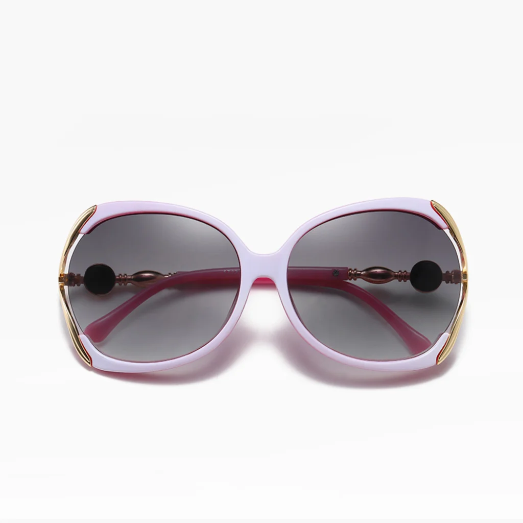 - Elegáns és egyedi design: A nagyméretű, enyhén pillangó formájú keret klasszikus és modern stílust kölcsönöz viselőjének, kiemelve az arc vonásait. A keret élénk rózsaszín árnyalata, a szürke árnyalt lencsékkel és az arany színű ötvözet díszítőelemekkel a szárakon nőies és luxus érzetet sugároz.