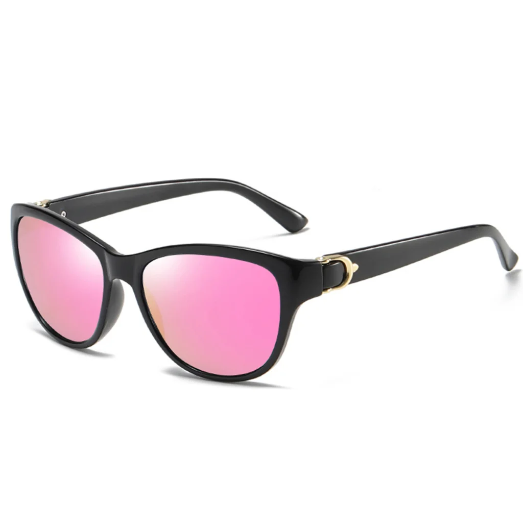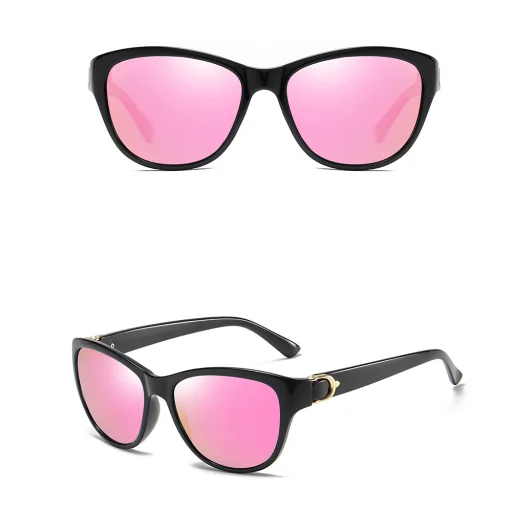 - Stílusos design: A letisztult, fényes fekete keret elegánsan ötvöződik a feltűnő pink tükrös lencsékkel, modern és nőies megjelenést biztosítva. A klasszikus, enyhén macskaszem formájú kialakítás minden arcformához kiválóan illeszkedik, míg a szárvégen található finom, arany színű díszítés extra kifinomultságot és egyedi jelleget kölcsönöz.