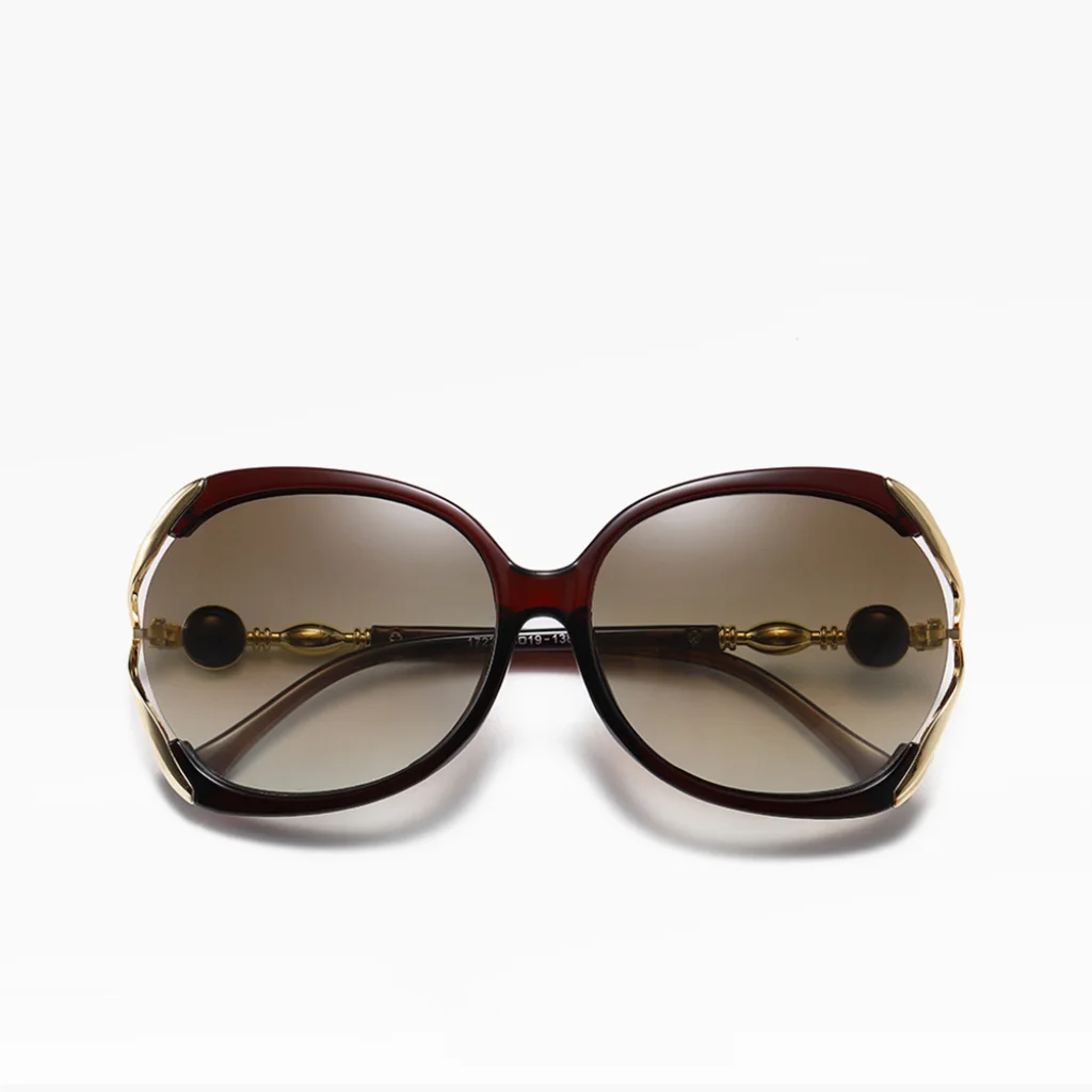 - Luxus ötvözet részletek: Az arany színű ötvözet díszítés a szár és a keret találkozásánál elegáns csavart és egyedi jelleget ad a napszemüvegnek, kiemelve annak prémium minőségét és a részletekre való odafigyelést.