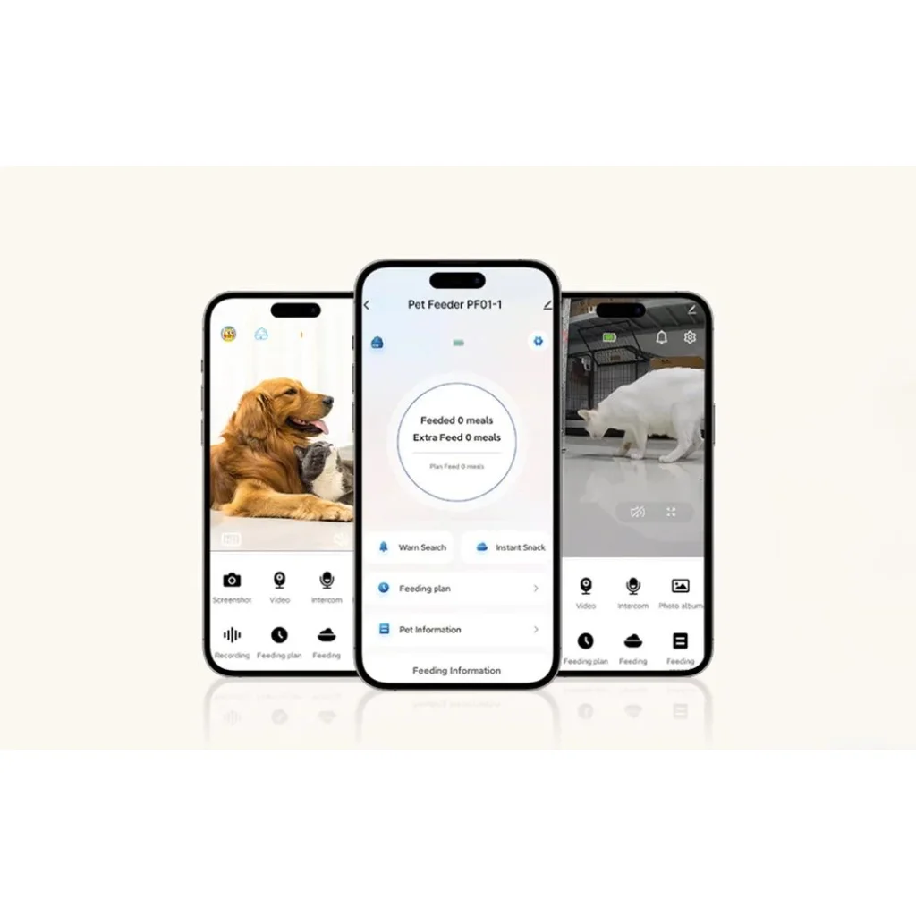 A mobilalkalmazásnak köszönhetően teljes ellenőrzést élvezhet háziállata etetése felett, függetlenül attól, hogy hol tartózkodik. Lehetőség van napi akár 6 étkezés beállítására és az adagok méretének igazítására a háziállat egyedi igényeihez. Az alkalmazás lehetővé teszi étkezések hozzáadását, értesítések megtekintését az ételmaradék szintjéről, háziállata információinak kezelését és egy 10 másodperces hangüzenet rögzítését, amely az etetési időben lejátszásra kerül. Ezzel a megoldással háziállata ismerős hangot hall majd az étkezésre hívás közben.