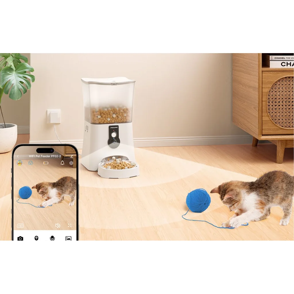 A Petsuper PF01-2 okos etető egy 1080P HD kamerával van felszerelve, amely bármikor tiszta és részletgazdag képet biztosít háziállatáról, köszönhetően az éjjellátó funkciónak. A 150° széles látószögű lencsének köszönhetően nagyobb területet figyelhet meg, így jobban ellenőrizheti háziállata környezetét. Emellett, amikor mozgást észlel, értesítést kap a mobilkészülékére.