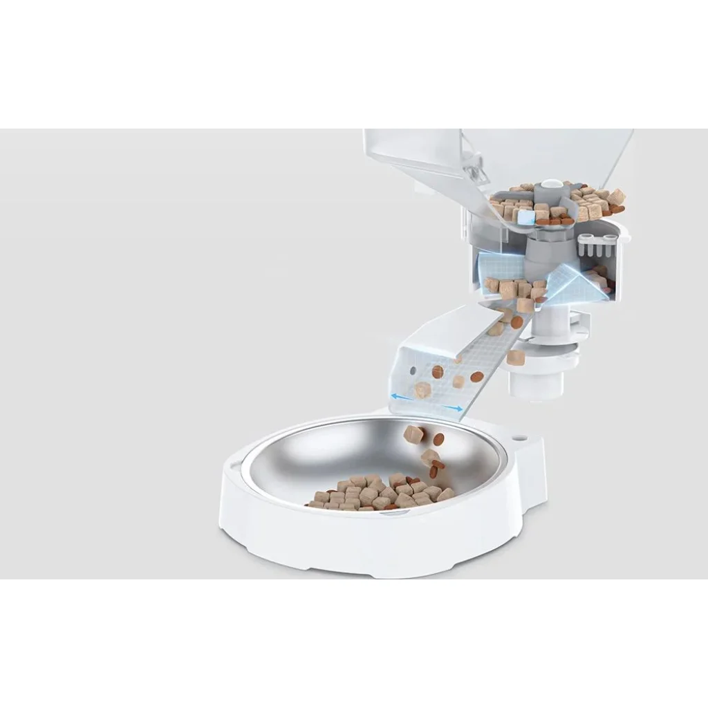 Az innovatív rendszer biztosítja a különböző típusú ételek - a száraz, a fagyasztott-szárított és vegyes formák zökkenőmentes adagolását. A széles nyílásokkal és lágy keverő mechanizmussal rendelkező speciális kialakítás megelőzi az eltömődést. Így biztos lehet benne, hogy háziállata mindig időben megkapja az ételét.
