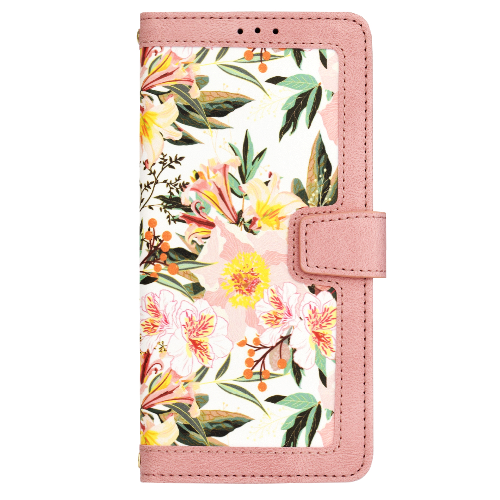 A tok külső borítása kellemes tapintású, strapabíró műbőrből készült, finom textúrával és precíz varrással az éleken, ami prémium érzetet nyújt. Az élénk "Sweetheart Pink" alapszínt gyönyörű, részletes virágmintázat egészíti ki, mely fehér alapon sárga, rózsaszín és narancssárga virágokat, valamint zöld leveleket vonultat fel. Ez a mintázat nem csak a tok elején, hanem a hátlap jobb szélén is visszaköszön, egységes és harmonikus összképet alkotva. A mágneses záródás biztonságosan tartja egyben a tokot, megóvva kijelződet a karcolásoktól és sérülésektől.