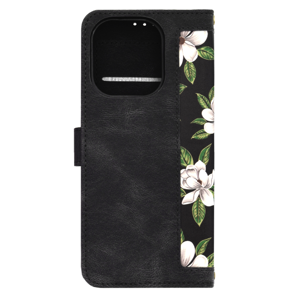A tok lenyűgöző "Hajnal virágai" mintázattal rendelkezik, amely élettel teli, fehér magnóliaszerű virágokat ábrázol zöld levelekkel, elegáns fekete alapon. Ez a kifinomult design garantáltan felhívja magára a figyelmet, és egyedi karaktert kölcsönöz telefonjának. Az időtlen virágminta frissességet és eleganciát sugároz.