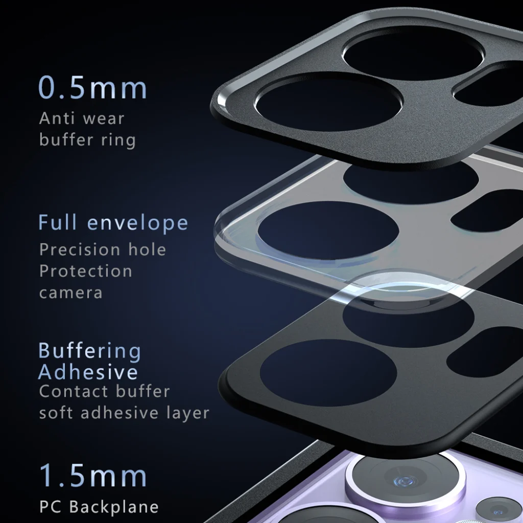 - Kamera védelem: A kamera területén precíz kivágásokkal és egy 0,5 mm-es kopásgátló puffergyűrűvel van ellátva, amely védi a lencséket a közvetlen érintkezéstől. A kamera teljes burkolata (full envelope) és egy pufferelő ragasztóréteg biztosítja, hogy a lencsék és a kameramodul biztonságban legyenek. Az 1,5 mm vastag PC hátlap tovább növeli a kamera körüli robusztus védelmet.