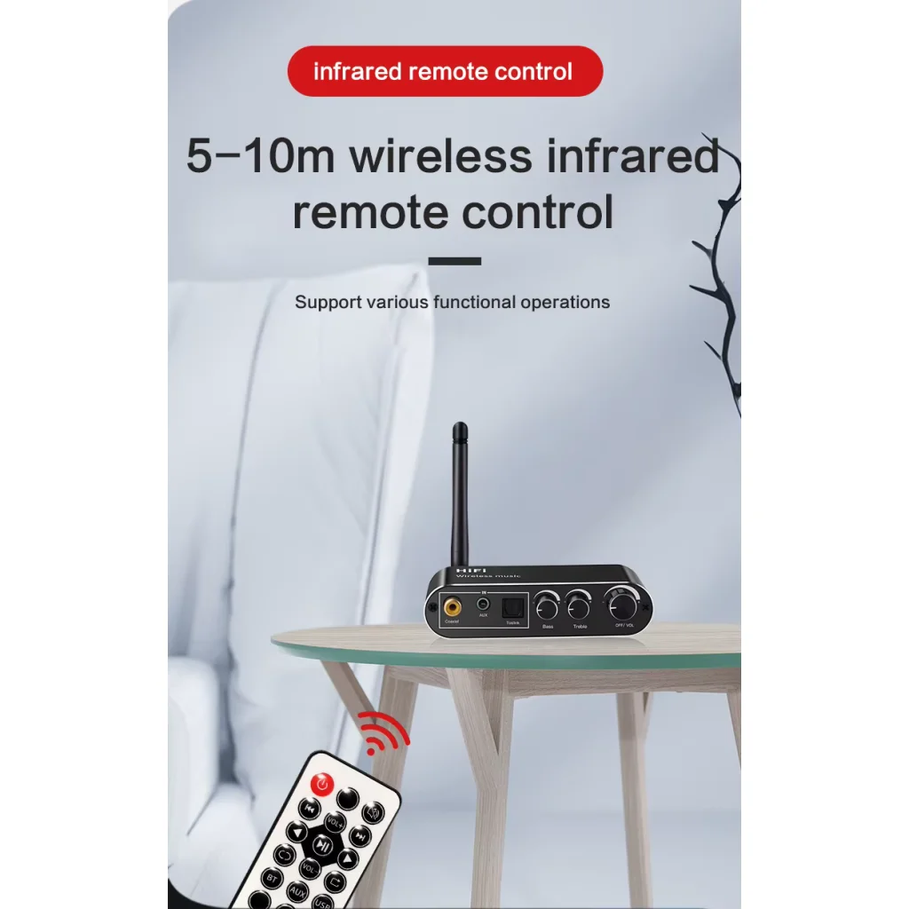 - Infravörös távirányító: Vezérelje kényelmesen a készüléket akár 5-10 méteres távolságból, beleértve a hangerő, lejátszás és bemenet kiválasztását.