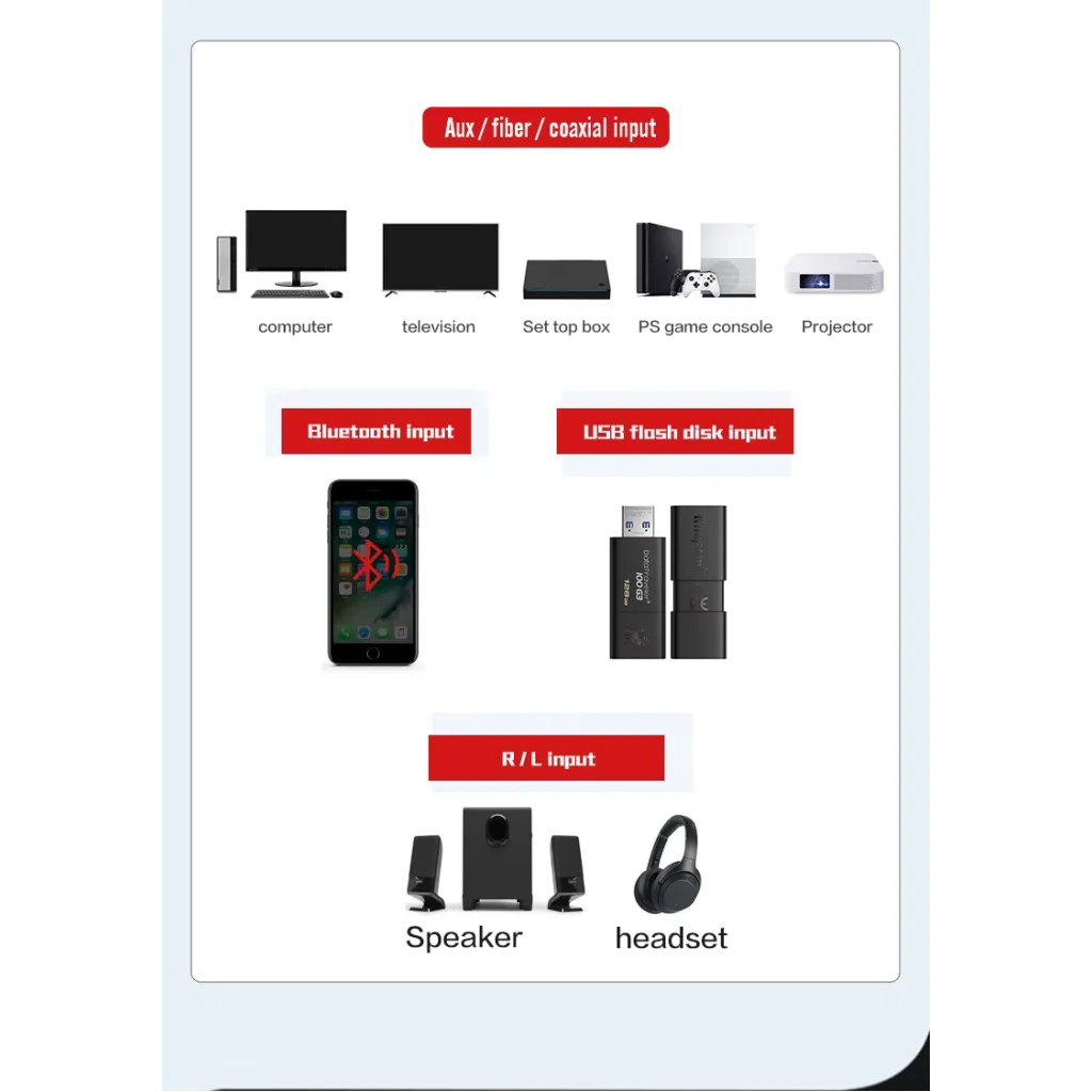 | Bemenetek | Optikai szál, Koaxiális, AUX (3.5mm), USB (U disk), Bluetooth |