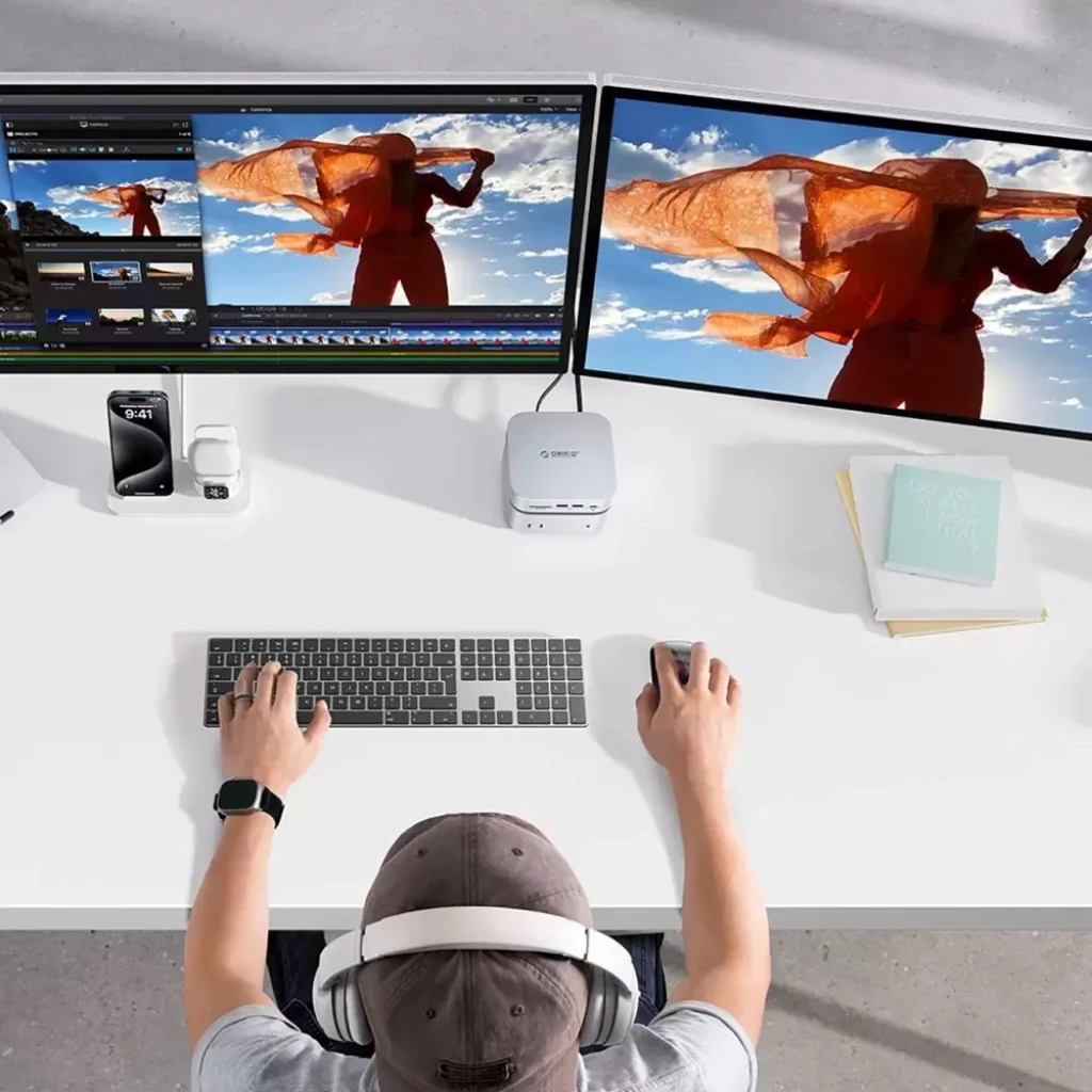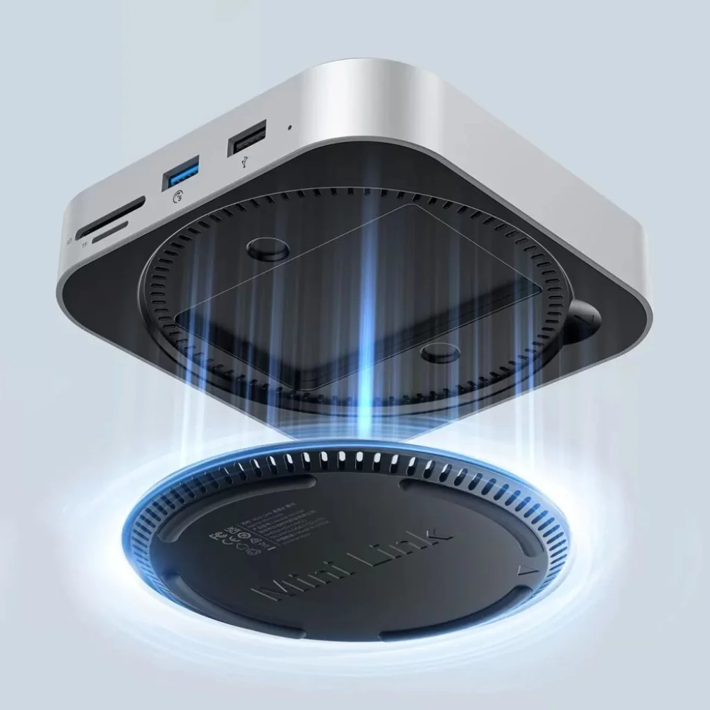 Az Orico MiniLink 9 az 1-ben dokkoló állomás egy kompakt bővítőközpont asztali számítógépekhez és laptopokhoz, különösen a Mac minihez tervezve. Egyesíti a USB hubot, a nagy sebességű hálózati portot és a merevlemez rekeszt egyetlen házban, lehetővé téve a munkaállomás kényelmes bővítését anélkül, hogy további asztali helyet foglalna. Az alumínium konstrukció elősegíti a hőelvezetést, és a mágneses alsó burkolat szerszám nélküli meghajtó telepítést tesz lehetővé.