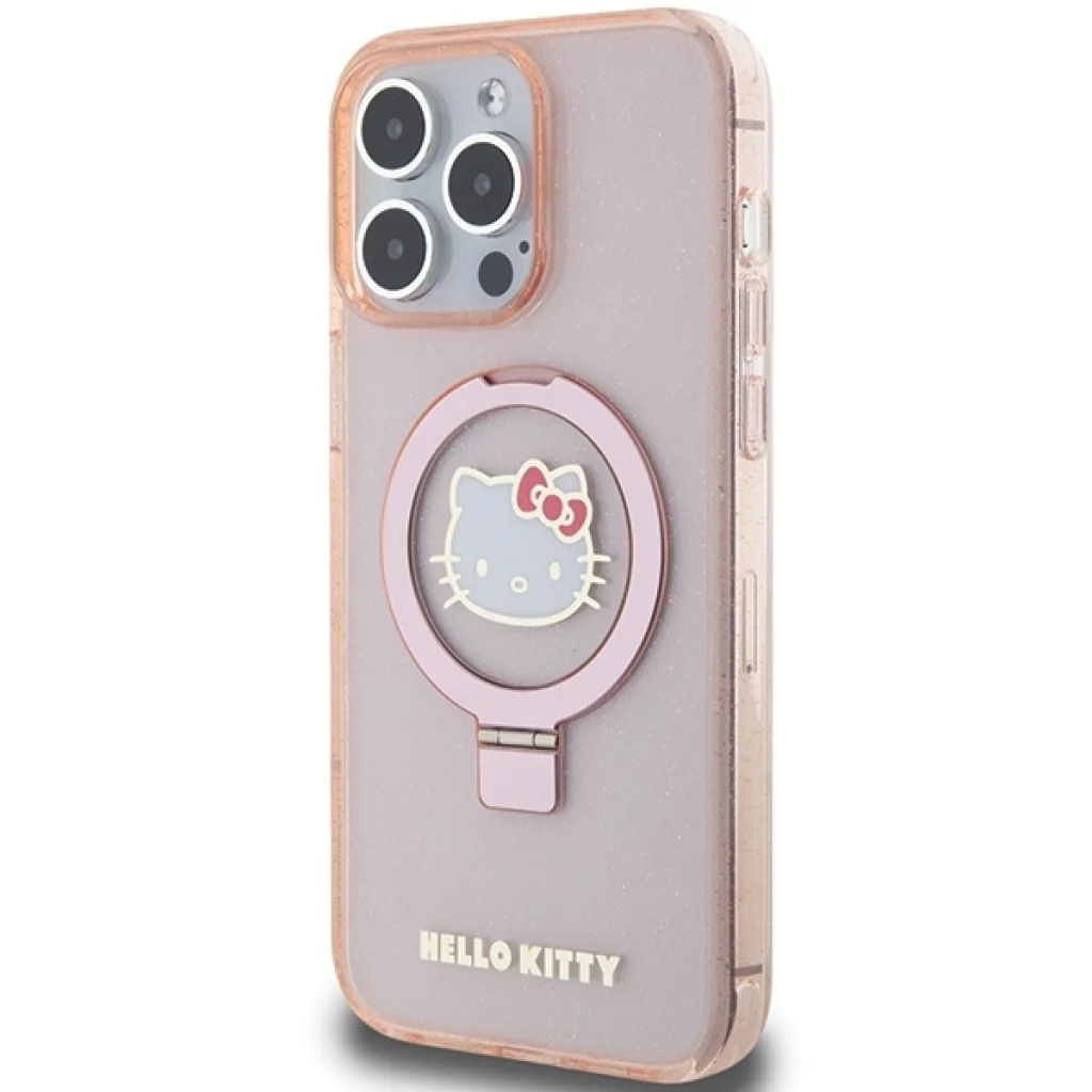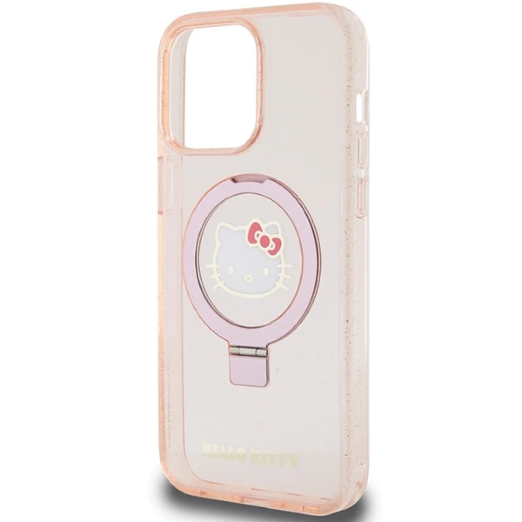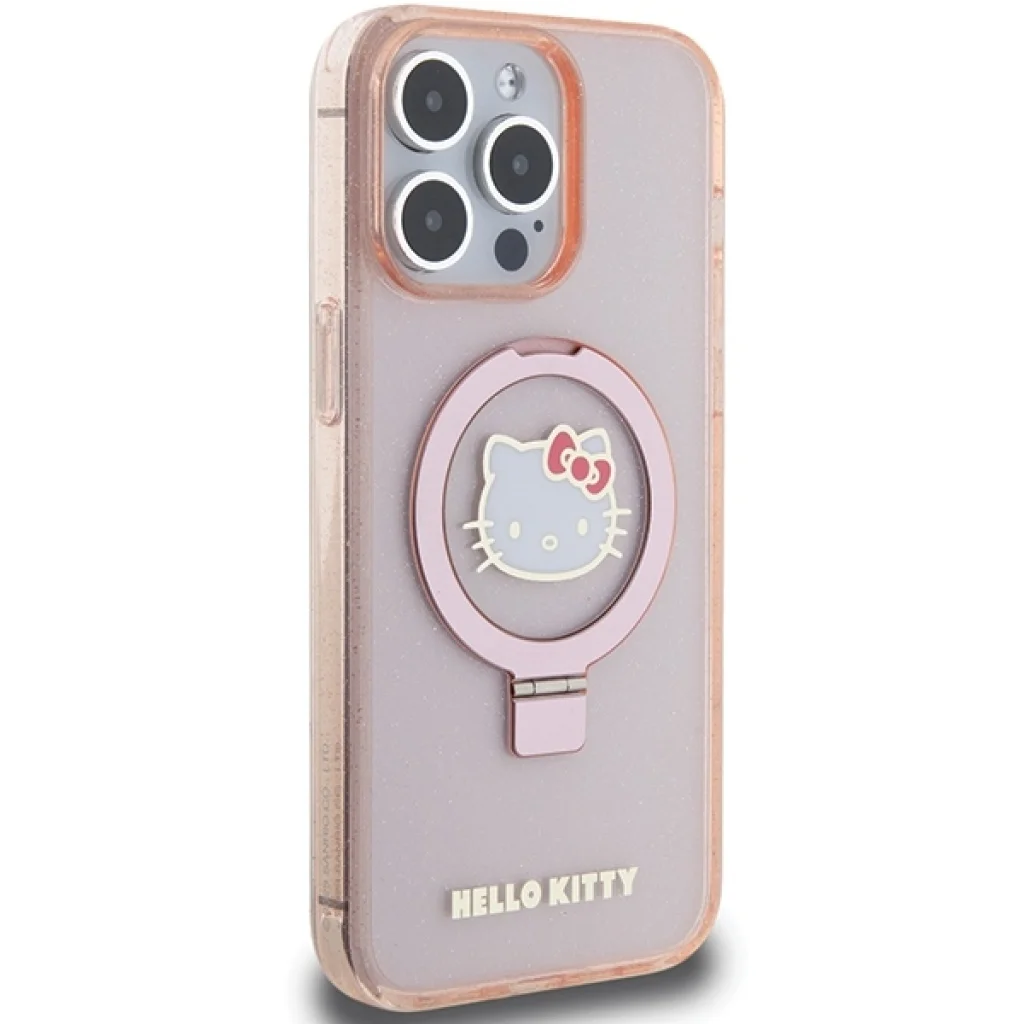 Original Case HELLO KITTY kemény tok gyűrűtartóval, csillámos, elektropolírozott logóval, MagSafe kompatibilis, HKHMP15XHRSGEP, iPhone 15 Pro Max, rózsaszín