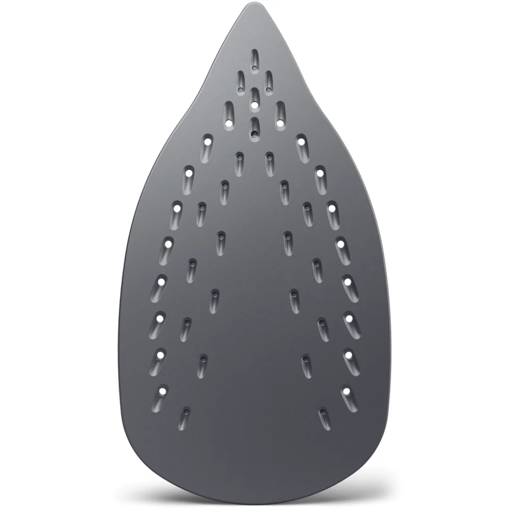 - Optimalizált vasalótalp: A speciálisan kialakított vasalótalp számos gőzkimeneti nyílással biztosítja az egyenletes gőzeloszlást, és könnyedén csúszik minden anyagon. Hegyes orra könnyedén éri el a gomb körüli és más nehezen hozzáférhető területeket.