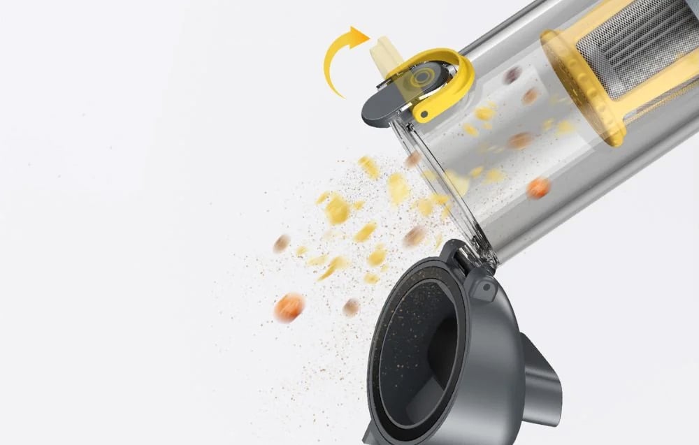 A tartály és a szűrőrendszer egyszerű ürítése: A tartályból a szennyeződés véletlen kiömlését megakadályozó mechanizmus lehetővé teszi, hogy a tartályt a szennyeződéssel való érintkezés nélkül, egyetlen gombnyomással kiürítse. Az átlátszó ház lehetővé teszi a töltés ellenőrzését. A kettős szűrőrendszer (előszűrő + HEPA-szűrő) a porszemcsék akár 95,99%-át is eltávolítja, és mindkét elem könnyen eltávolítható és mosható, meghosszabbítva élettartamukat.