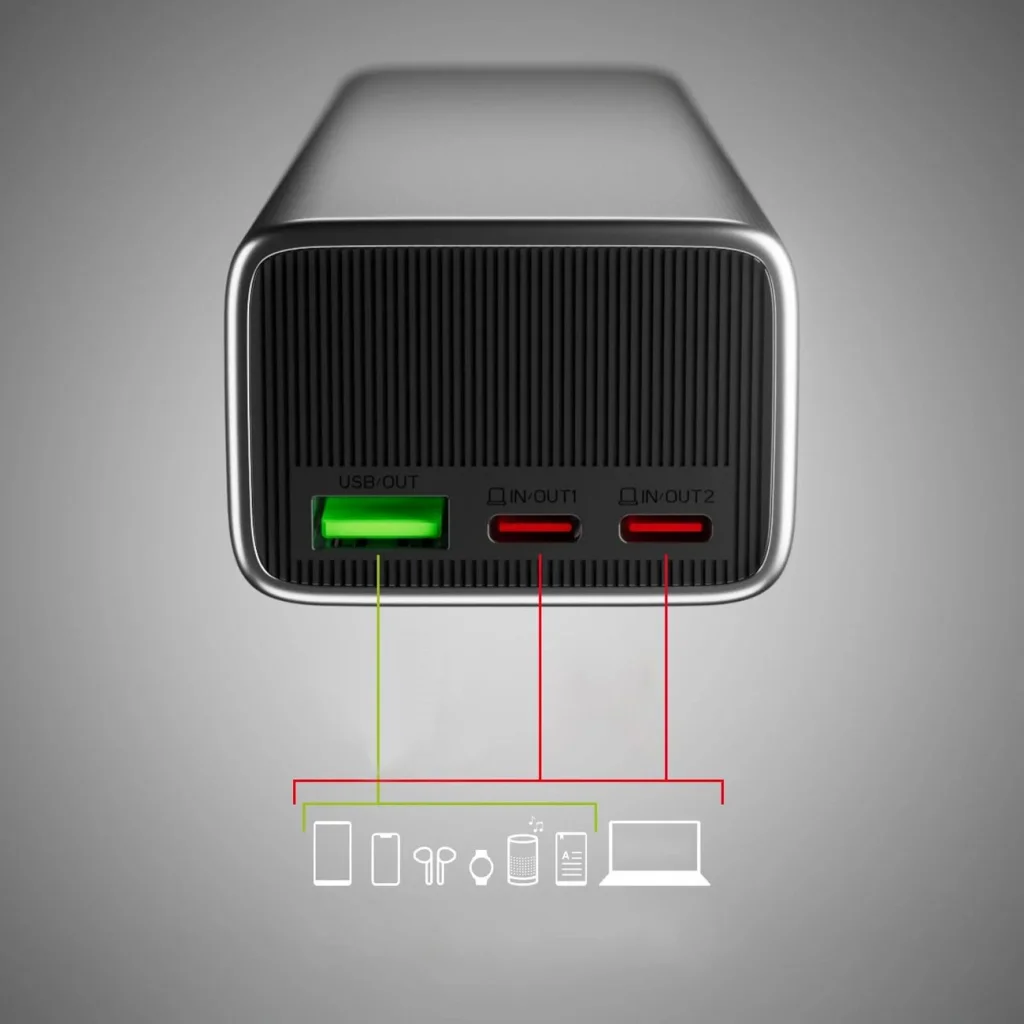 - Karcsú dizájn és tartósság: Az alumínium ház és a kompakt profil teszik a powerbankot tökéletes utazó- és munkatárssá.