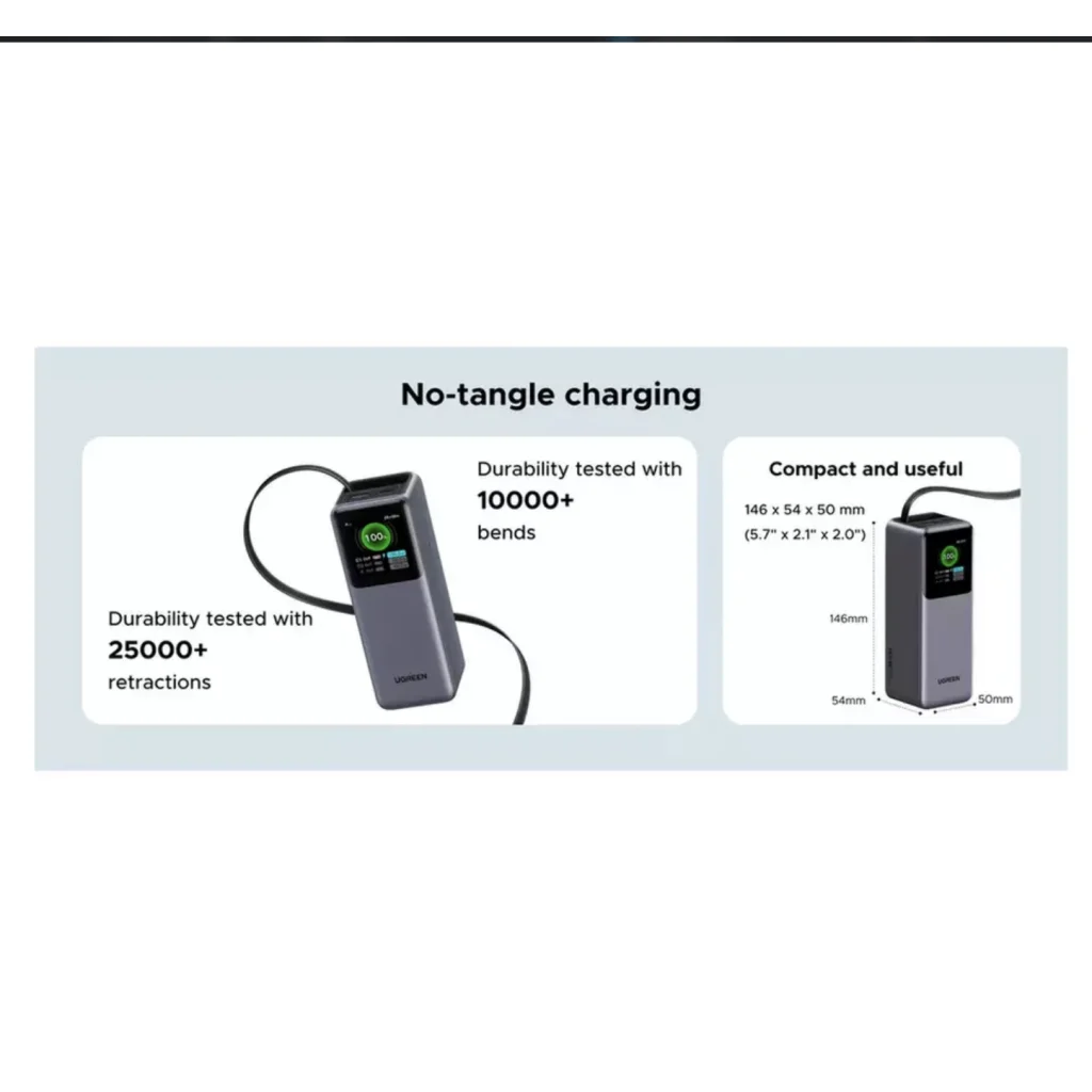 Az UGREEN PB726 (55987B) szürke színű power bank a letisztult formavilágot a praktikummal ötvözi. A beépített, 0,7 méteres USB-C kábel egyszerűen kihúzható és visszahúzható, így soha többé nem kell a zsinórok gubancolódásával küzdened. A kábel rendkívül strapabíró: több mint 25 000 kihúzást és 10 000 hajlítást is kibír. Kompakt mérete (146 x 54 x 50 mm) és súlya (530g) ellenére hatalmas energiát rejt, és légitársaságok által is elfogadott kapacitással rendelkezik, így ideális útitársad lesz.