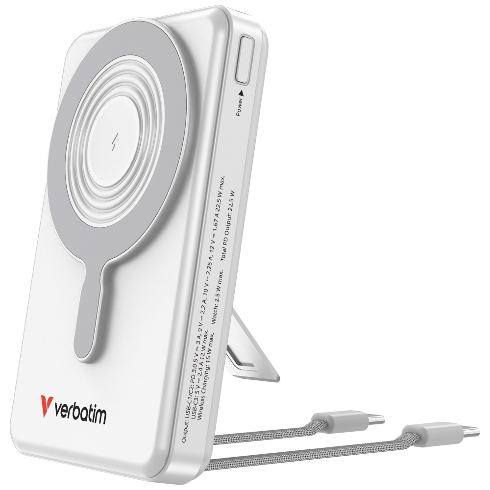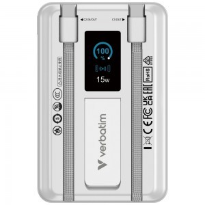 A Verbatim Charge 'n' Go powerbank egy praktikus energiaforrás 10000 mAh-es kapacitással, amelyet okostelefonok és mobil eszközök mindennapi töltésére terveztek. A modell TFT kijelzőt használ, amely mutatja az energiaszintet és az aktuális működési állapotot. Az eszköz kombinálja a vezetékes és vezeték nélküli töltést, növelve ezzel a kényelmet és rugalmasságot. Kompakt méretének köszönhetően a termék könnyen elfér egy táskában vagy hátizsákban, és egyszerre több eszköz töltésére is képes, növelve ezzel funkcionalitását. A Charge 'n' Go jól működik mind utazás, mind mindennapi tevékenységek során. Az eszköz átfogó tápellátási lehetőségeket kínál három USB-C portjának és a vezeték nélküli töltési modulnak köszönhetően. Két beépített USB-C kábel gyors eszköz-csatlakozást tesz lehetővé, és a PD 3.0 kompatibilis portok akár 22.5 W teljesítményű töltést is támogatnak. Az additional USB-C port akár 12 W kimeneti teljesítményt biztosít. A vezeték nélküli töltés támogatja az 5 W, 7.5 W, 10 W és 15 W szinteket, míg az okosóra részleg 2.5 W-ot kínál. Az eszköz a PD 3.0, QC 3.0, Apple 2.4 A, BC 1.2, DCP és AFC protokollokkal kompatibilis, biztosítva a különféle mobil eszközök stabil és hatékony töltését.