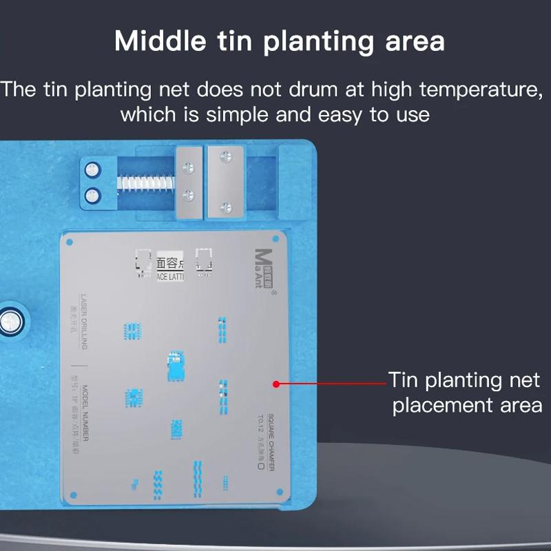 A MaAnt MR-01 egy professzionális munkatartó, amely kifejezetten az Apple iPhone 11-től 16-os sorozatú modellek újragolyózására és finom javítási műveleteire készült. Stabilitást, precizitást és biztonságot kínál forrasztás és alkatrészcserék során.