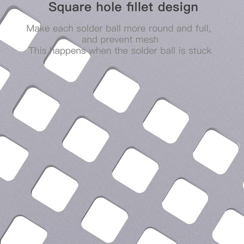 - Lekerekített sarok kialakítás és négyzet alakú lyukak, amelyek kerekebb forrasztási gömböket hoznak létre és megakadályozzák a stencil eltömődését
