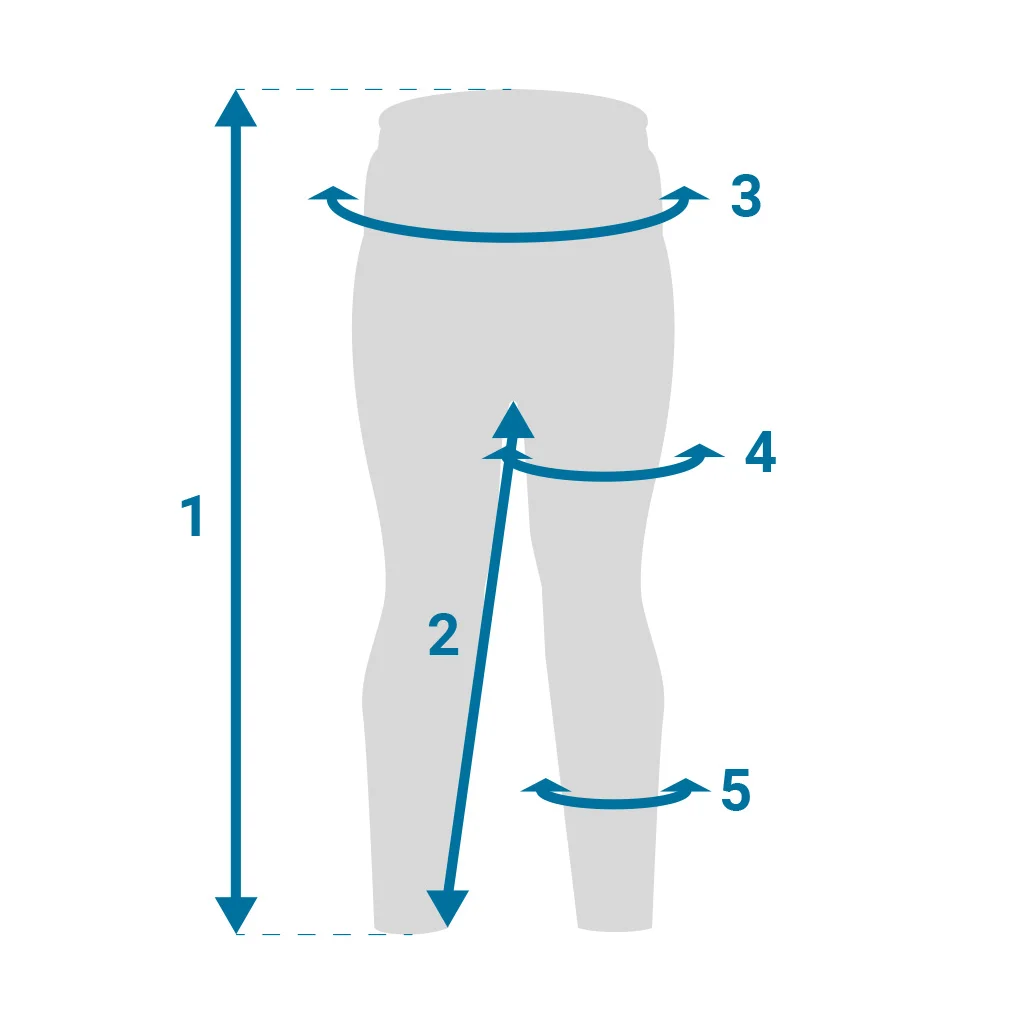 | Size | 1) External length (cm) | 2) Inner length (cm) | 3) Waist circumference (cm) | 4) Thigh circumference (cm) | 5) Calf circumference (cm) |