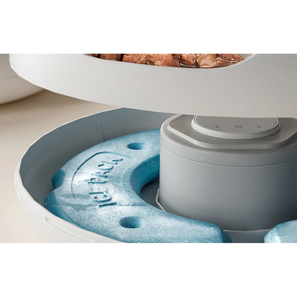 Az adagoló két hűtőbetétet használ az ételek frissen tartása érdekében a nap 24 órájában. Az első 8 órában az adagoló 0°C-on tartja az ételt. Ezt követően továbbra is fenntartja az alacsony tárolási hőmérsékletet. Így akár 24 órán keresztül nem kell aggódnia az ételek minősége miatt. Javasolt azonban, hogy a húsételeket kisállata 4-8 órán belül elfogyassza. A konzervétel viszont az egész nap folyamán fogyasztható.