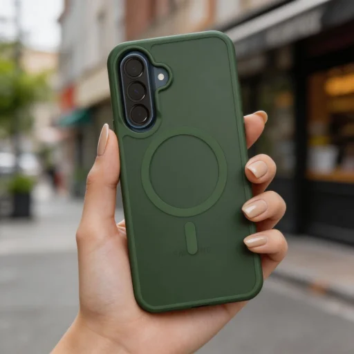 A kamera és a kijelző körül megemelt peremek védik a legérzékenyebb részeket a sík felületekkel való érintkezéstől. A beépített mágneses gyűrű teljes MagSafe kompatibilitást biztosít, lehetővé téve a mágneses kiegészítők használatát. A precíz kivágások teljes hozzáférést nyújtanak az összes porthoz, gombhoz és hangszóróhoz.