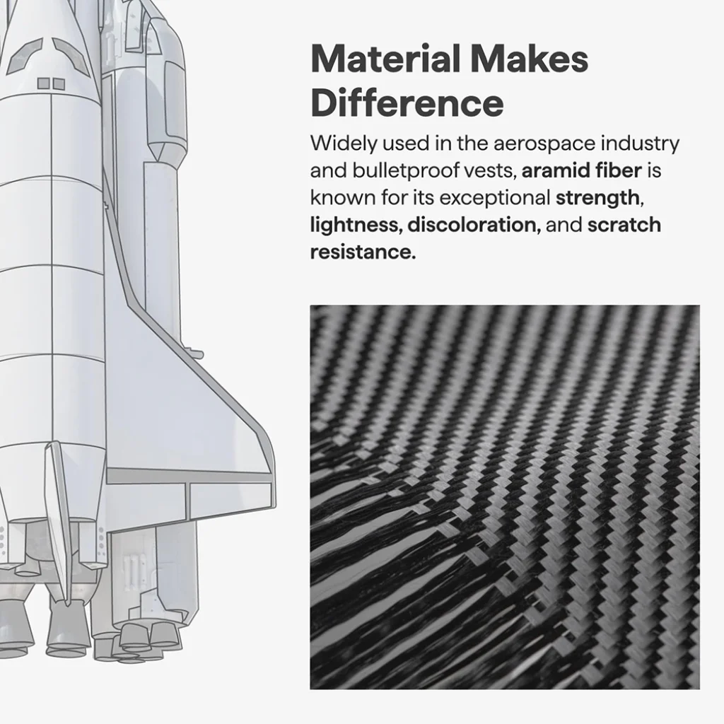 A tok anyaga aramid szál, amely az űriparban és a golyóálló mellények gyártásában is széles körben használt. Ez az anyag kivételes erősségéről, könnyedségéről, elszíneződés- és karcállóságáról ismert. A jellegzetes karbonmintás textúra nem csak stílusos megjelenést biztosít, de ellenáll a kopásnak és az idő múlásának.