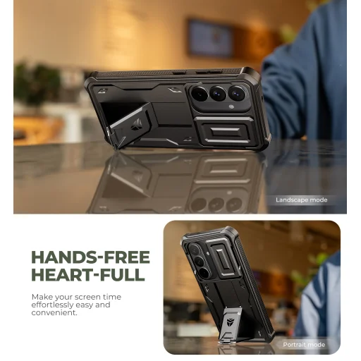 Az integrált, robusztus kitámasztóval felszabadíthatod a kezedet, és élvezheted a "hands-free" élményt. Nézz videókat, böngéssz vagy videótelefonálj kényelmesen, anélkül, hogy tartanod kellene a telefonodat. Az állvány stabil tartást biztosít fekvő (landscape) és álló (portrait) módban egyaránt, így a képernyőidőd még élvezetesebbé és kényelmesebbé válik.