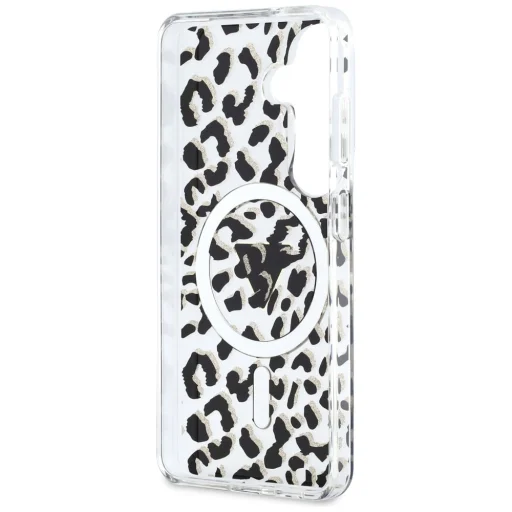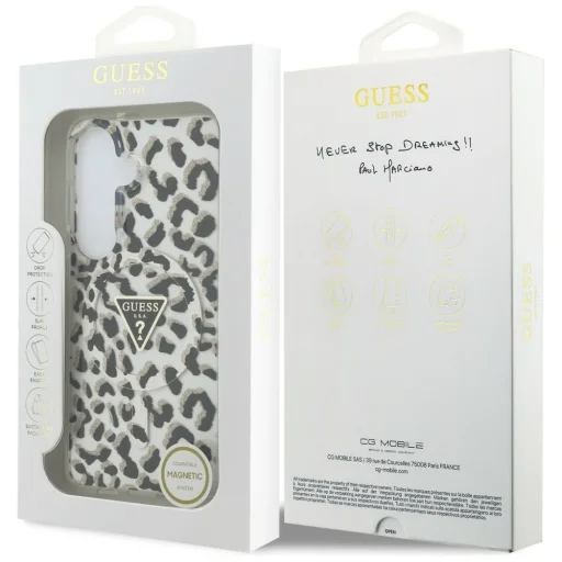 Egyedi megjelenés és kivételes minőség: Az exkluzív védőtok a neves Guess márkától a legmagasabb szintű elegancia és stílus kombinációja. A tok kiváló minőségű polikarbonátból és poliuretánból készült. A felületet egy állatmintázat díszíti, ami foltokra emlékeztet, és egy arany színű MagSafe gyűrű. A tok központi részén található a Guess logó, amely finoman hangsúlyozza a tok presztízsét. Ez a funkcionalitás és az elegáns design tökéletes kombinációja, amely nemcsak tökéletes védelmet nyújt telefonjának, hanem divatos kiegészítővé is teszi azt. A tok egy praktikus pánttal van felszerelve, amely megkönnyíti a telefon tartását és megakadályozza a véletlen ejtéseket.