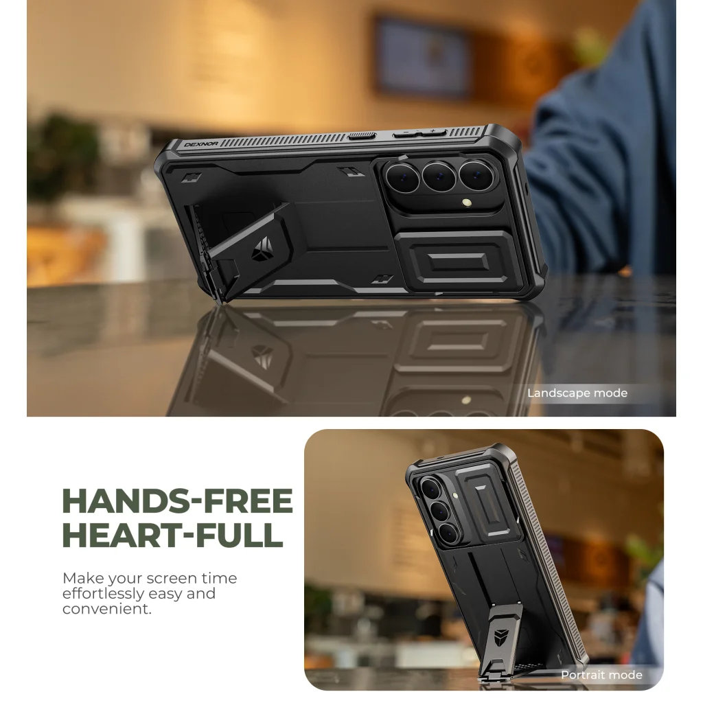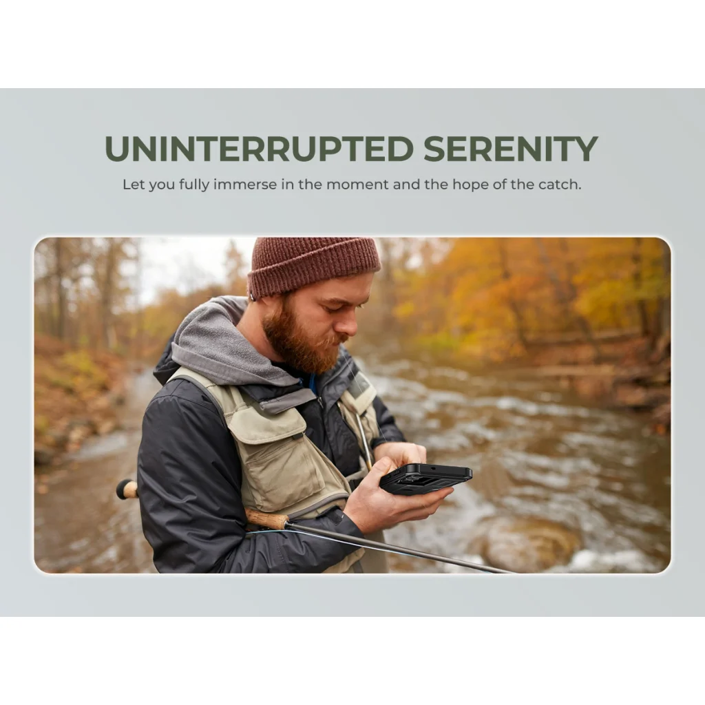 A Dexnor tok nem csupán véd, hanem növeli a használat kényelmét is. Az innovatív, kihajtható állványnak köszönhetően könnyedén élvezheted a "HANDS-FREE HEART-FULL" élményt. Állítsd a telefont fekvő (landscape mode) vagy álló (portrait mode) módba, és nézz videókat, tarts videóhívásokat vagy böngéssz az interneten teljesen kényelmesen. Ez a funkció lehetővé teszi, hogy teljesen elmerülj a pillanatban és a horgászat reményében ("Uninterrupted serenity"), anélkül, hogy a telefont folyamatosan tartanod kellene. Erősítsd meg a természettel és egymással való kötelékedet – pillanatok, amiket megosztunk ("Moments we share").