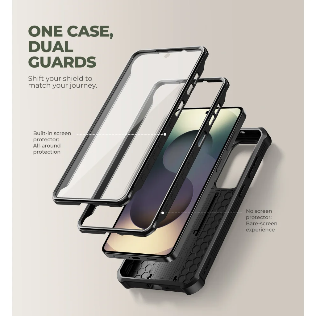 Ez a robusztus tok a katonai minőségű védelem élvonalát képviseli, garantálva a telefonod biztonságát a legmostohább körülmények között is. A 360 fokos ütésálló kialakítás minden oldalról óvja a készüléket, a megerősített BumperShock sarkokkal pedig a váratlan ütések és esések ellen is felvértezi. A „kettős védelem” koncepciójával (One Case, Dual Guards) a Dexnor tok lehetővé teszi, hogy a beépített, karcálló képernyővédőt használd a teljes körű védelem érdekében, vagy választhatsz egy alternatív előlapi keretet a „bare-screen” élményhez, amennyiben saját képernyővédődet preferálod.