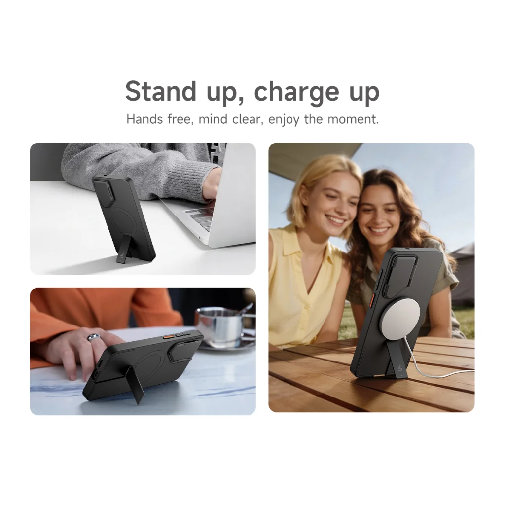 Tapasztalja meg a mágneses rögzítés kényelmét! A tokba integrált, erős Magsafe mágnesek biztosítják a gyors és stabil csatlakozást a Magsafe kiegészítőkhöz, legyen szó vezeték nélküli töltőről vagy autós tartóról. A „Snap and go” élmény garantált, akár 13.28N mágneses erővel, amely megbízhatóan tartja telefonját. A beépített kihajtható állvány lehetővé teszi, hogy „felállítsa, feltöltse” készülékét. Élvezze a kéz nélküli filmnézést, videóhívásokat vagy a vezeték nélküli töltés kényelmét – tiszta fejjel, teljesen a pillanatnak szentelve magát.