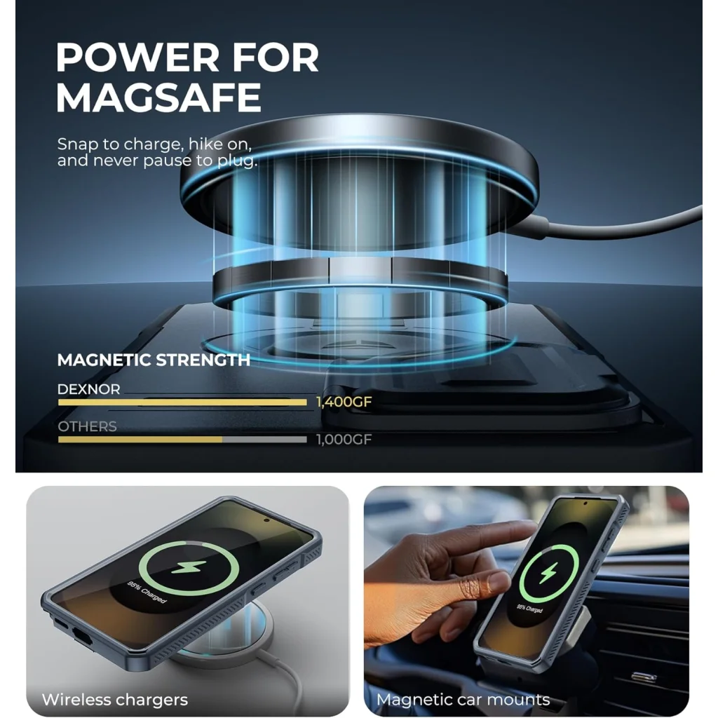 A Dexnor tok robusztus kialakítása ellenére sem kell lemondanod a modern kényelemről! Az akár 1400g (1400GF) mágneses tartóerővel ez a tok zökkenőmentesen csatlakozik az összes MagSafe-kompatibilis tartozékhoz. Legyen szó vezeték nélküli töltőről vagy mágneses autós tartóról, telefonod mindig biztonságosan a helyén marad, bármilyen helyzetben is legyél.