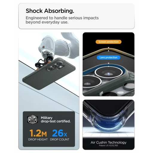 - Katonai szintű ütésállóság: A tartós és rendkívül rugalmas TPU anyagból készült tok a sarkokban Air Cushion Technology® technológiát alkalmaz, amely légtereket hoz létre az ütések hatékony elnyelésére esés közben. A tok Military drop-test minősítéssel rendelkezik, ami azt jelenti, hogy 1.2 méterről, 26 leejtés esetén is bizonyítottan megvédi a telefont a komolyabb sérülések ellen, túlszárnyalva a mindennapi használat során felmerülő behatásokat.