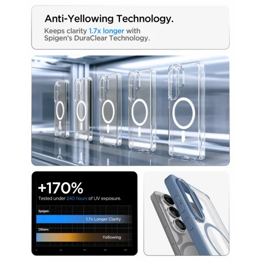 Az Ultra Hybrid Mag tok nemcsak véd, hanem meg is mutatja telefonja eredeti szépségét. A Spigen DuraClear™ Anti-Yellowing Technology segítségével a tok 1.7-szer hosszabb ideig őrzi meg kristálytiszta átlátszóságát, mint a hagyományos tokok, ellenállva a sárgulásnak akár 240 órás UV-sugárzásnak kitéve is. Az optimalizált anyagösszetétel – PET 1 (felső átlátszóság, prémium fényesség), PC lap (kristálytiszta megjelenés, ütésálló), PET 2 (nedvességálló, formahű) és TPU (rendkívül rugalmas, ütéselnyelő) – garantálja a tartós, esztétikus megjelenést.