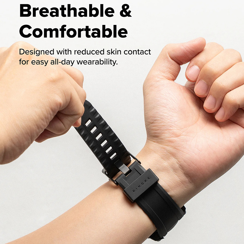 - Légáteresztő és kényelmes: A csökkentett bőrkontaktusra tervezett szíj a speciális kialakításnak köszönhetően légáteresztő, így egész napos viselet során is maximális kényelmet nyújt, megakadályozva az izzadást.
