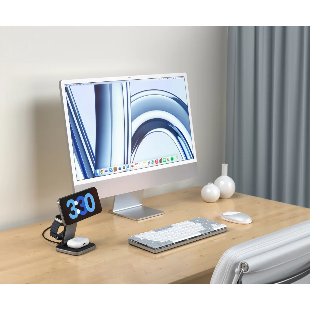 - 3 az 1-ben vezeték nélküli töltés: Egyetlen stílusos állványon töltheti iPhone készülékét (Qi2 technológiával, akár 15W-tal), Apple Watch óráját, és AirPods vagy más Qi-kompatibilis fülhallgatóját. Nincs több kábelrengeteg!
