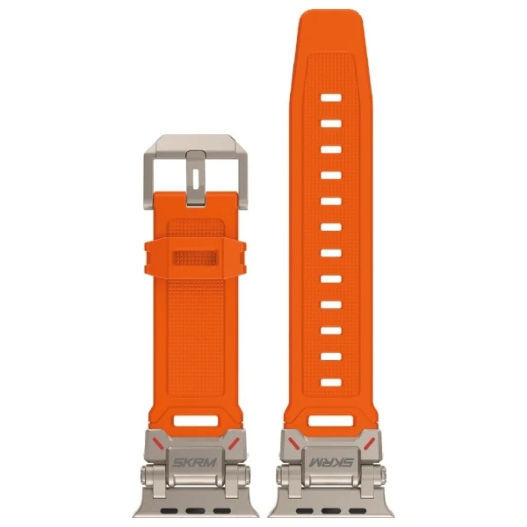 A SKRM logóval ellátott acél elemek nemcsak az erő jelképei, hanem az egyediség stílusát is tükrözik. A szíj magas minőségű rozsdamentes acélból készült egyedi csatlakozókkal van felszerelve, növelve a sérülésekkel szembeni ellenállását. A fém csat és tű megbízható rögzítést biztosít, miközben elegáns megjelenést kölcsönöz.