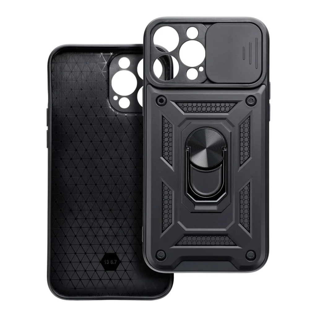 A Slide Armor tok beépített gombfedőkkel, állványként használható forgó gyűrűvel, és egy egyedi csúszkával rendelkezik, amely védi a kamerát. A Slide Armor azok számára kínál megoldást, akiknek fontos a telefon tökéletes védelme. A tok beépített kamerafedő csúszkával rendelkezik, amely használaton kívül eltakarja a kamerát, ezáltal biztosítja a magánszférát és védi az objektívet a töréstől vagy karcolódástól esés esetén. Az eszközhöz illeszkedő borítás precíz kivágásokkal rendelkezik a portok és hangszórók számára, beépített gombfedőkkel és egy speciális, 360°-ban forgatható gyűrűvel van felszerelve. Ez megkönnyíti a telefon kézben tartását, vagy filmezéshez állványként használható a gyűrű.