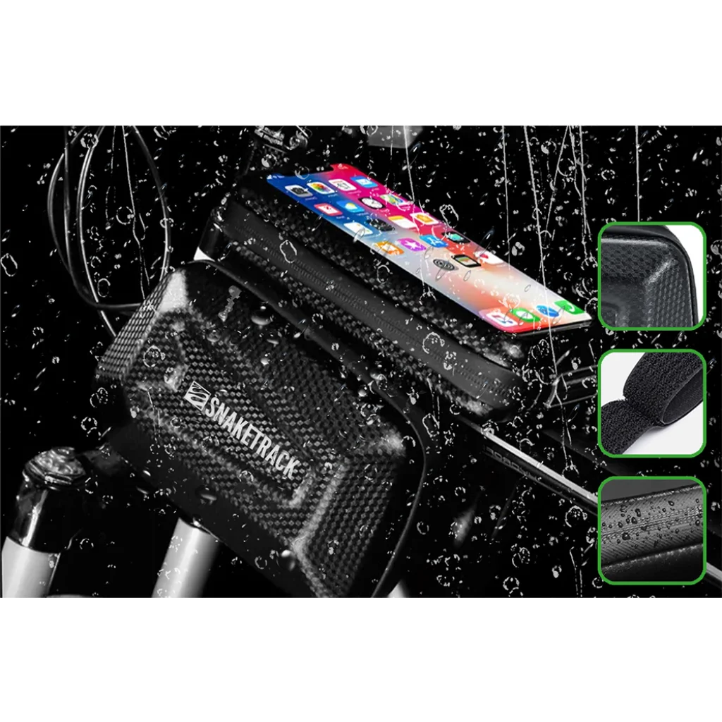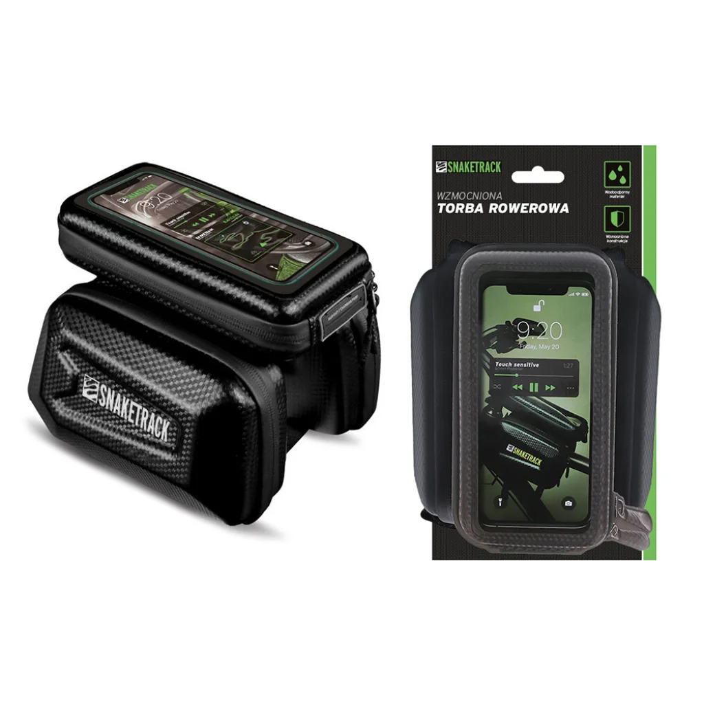 A vízálló Snake Track kerékpáros táska lehetővé teszi, hogy kényelmesen használjuk telefonunkat vagy navigációnkat kerékpározás közben, még esős időben is. A megerősített "hard-shell" kialakítás és a nagy kapacitás (1,5L) lehetővé teszi kisebb tárgyak biztonságos szállítását, mint például kulcsok, szerszámok, pénztárca, telefon, kerékpárzár, sőt kis ital vagy szendvics is. A táska összeszerelése gyors és egyszerű – nincs szükség szerszámokra. Az érintőképernyős filmborításnak köszönhetően a telefonunkat anélkül használhatjuk érintőképernyőn, hogy ki kellene venni a táskából. A termék a kerékpárvázra van rögzítve, biztosítva a szállított telefon biztonságát. A telefonnak szánt tér mérete 18 x 8 cm, az ablak pedig 16,2 x 6,6 cm.