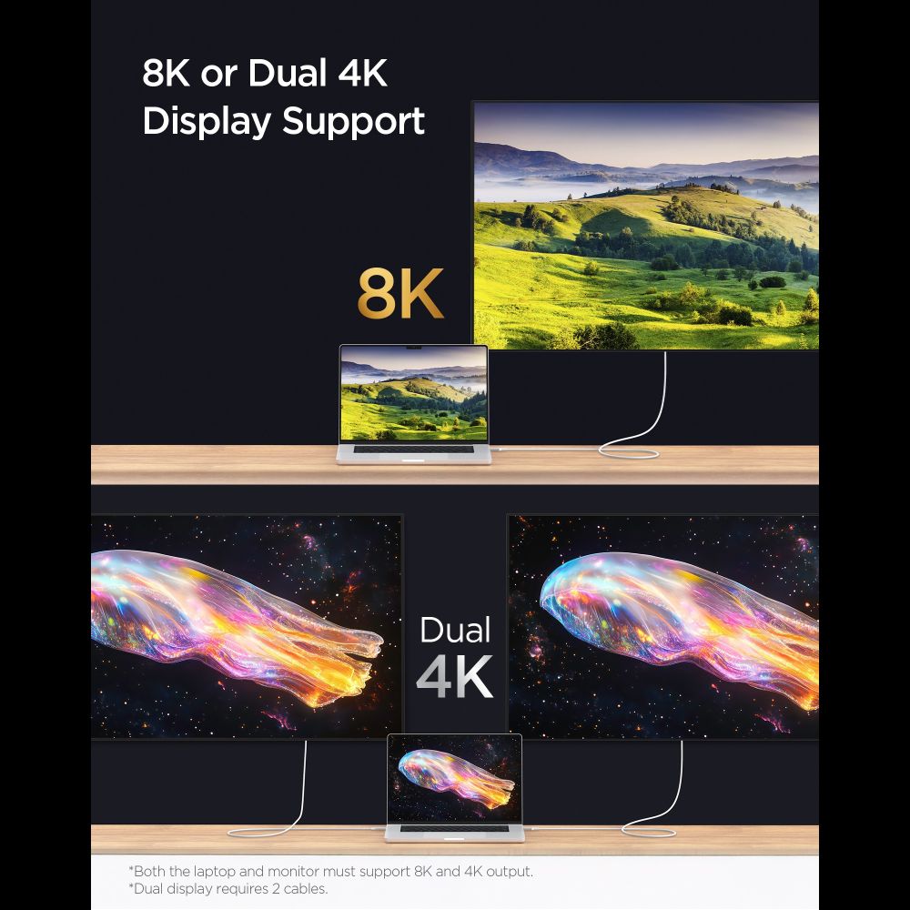 A kábel a Thunderbolt 3/4 szabványok támogatásával a követelményes feladatokat is könnyedén kezeli — képes 8K (egy csatornás) / 4K (két csatornás) videóátvitelre a DisplayPort 2.0 segítségével, ami nagyszerű választássá teszi monitorok, laptopok vagy dokkoló állomások csatlakoztatásához.