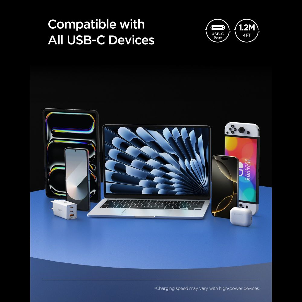 A Spigen Essential EB24012CC egy magas minőségű töltő- és adatátviteli kábel, amelyet az USB-C porttal rendelkező legigényesebb eszközökhöz terveztek — az okostelefonoktól és táblagépektől kezdve a laptopokig. A kábel akár 240 W-ig támogatja a Power Delivery töltést, ami lehetővé teszi a nagy teljesítményigényű eszközök gyors és stabil töltését.