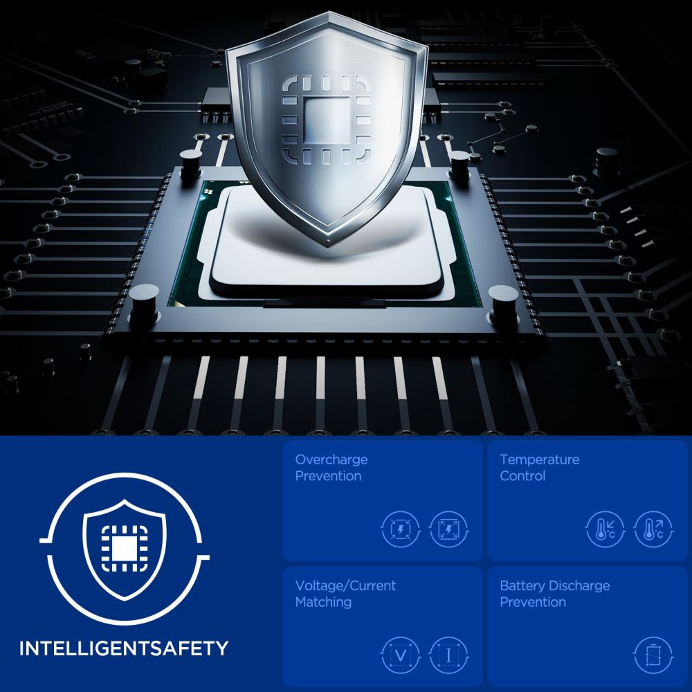 - Intelligens 15 fokozatú biztonsági rendszer: Átfogó védelmet nyújt a túltöltés, túlmelegedés, túlfeszültség, túláram és akkumulátor kisülés ellen (Intelligent Safety).