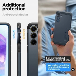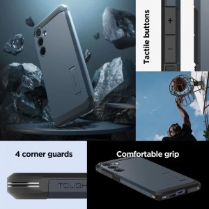 A Spigen Tough Armor sorozatából származó tok az egyik legújabb védőborítás a vállalat kínálatában. Két részből álló szerkezete kopásálló termoplasztikus anyagból és megerősített polikarbonát keretből készült. A tok belsejében technológiai hab kitöltőanyag található, amely további védelmet nyújt az ütések és az esések ellen. A tok beépített állvánnyal rendelkezik, amely lehetővé teszi, hogy könnyedén megtekinthesse a telefon kijelzőjén történő eseményeket anélkül, hogy tartania kellene a készüléket. A tok tökéletesen illeszkedik, és nem korlátozza a vezeték nélküli töltés lehetőségét. A kamera és a kijelző körüli enyhén megemelt házformája megvédi azokat a karcolásoktól, mivel a telefon éppen egy kicsit a sík felület fölé emelkedik. Gombfedelek és portkivágások is találhatóak rajta. A Tough Armor olyan ház, amely 26 alkalommal volt kitéve 1,2 méteres magasságból történő esési tesztnek, így megszerezte az amerikai katonai minősítést MIL-STD 810G-516.6.