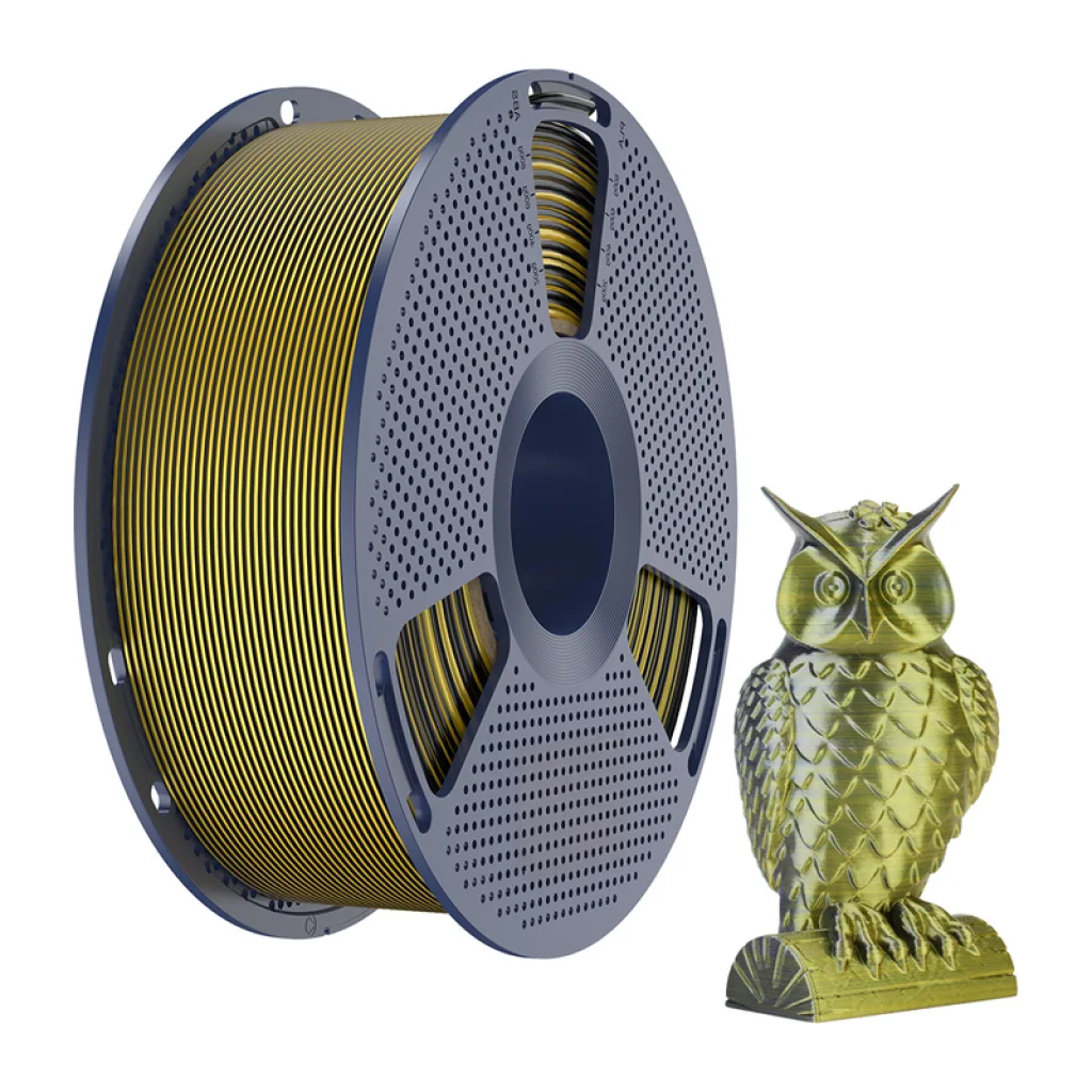 A Sunlu PLA+ Silk kétszínű filament fekete-arany változatát azok számára tervezték, akik egyedi és feltűnő megjelenést szeretnének adni 3D nyomataiknak. A Multi Color technológiának köszönhetően egyetlen filamenttel is többszínű hatás érhető el, a kész modellek megjelenése pedig a fény beesési szögétől és a nézőponttól függően változik. Kiváló választás dekorációs projektekhez, figurákhoz, kütyükhöz, prototípusokhoz és minden olyan feladathoz, ahol a pontosság és az eredeti vizuális hatás egyaránt fontos.