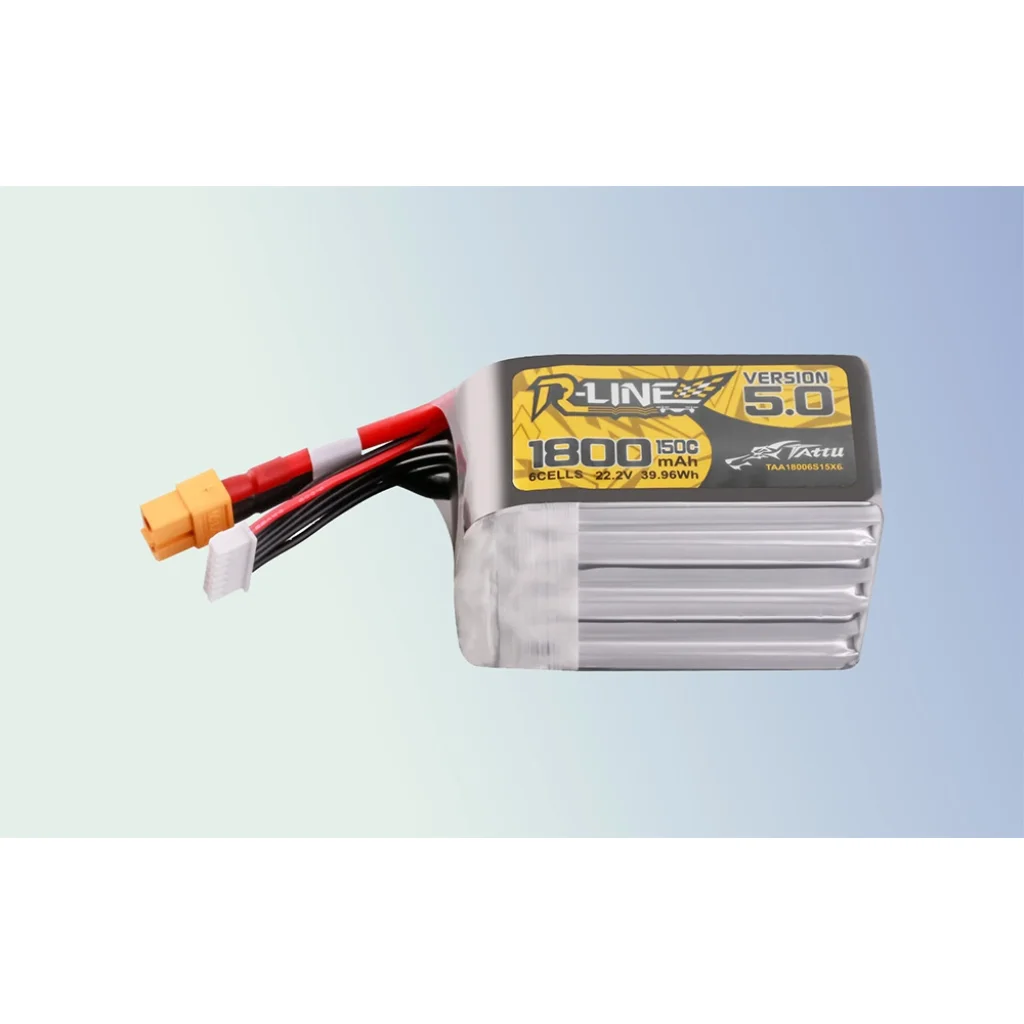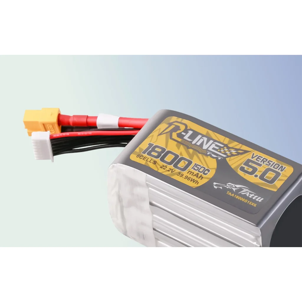A Lipo Tattu R-Line 5.0 verzió 1800mAh 22.2V 150C 6S akkumulátor XT60 csatlakozóval kiváló választás a profi FPV versenyzők számára, akik megbízható energiát keresnek FPV modelljeikhez. Egyedülálló gyártási technológiájának és fejlett anyagainak köszönhetően kiemelkedő teljesítményt, nagy kapacitást és kivételes teljesítményt nyújt, ami a legnehezebb körülmények között is teljesít.