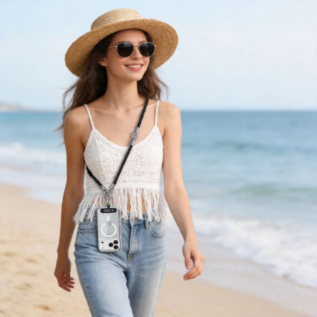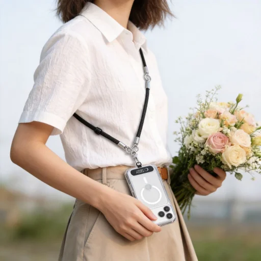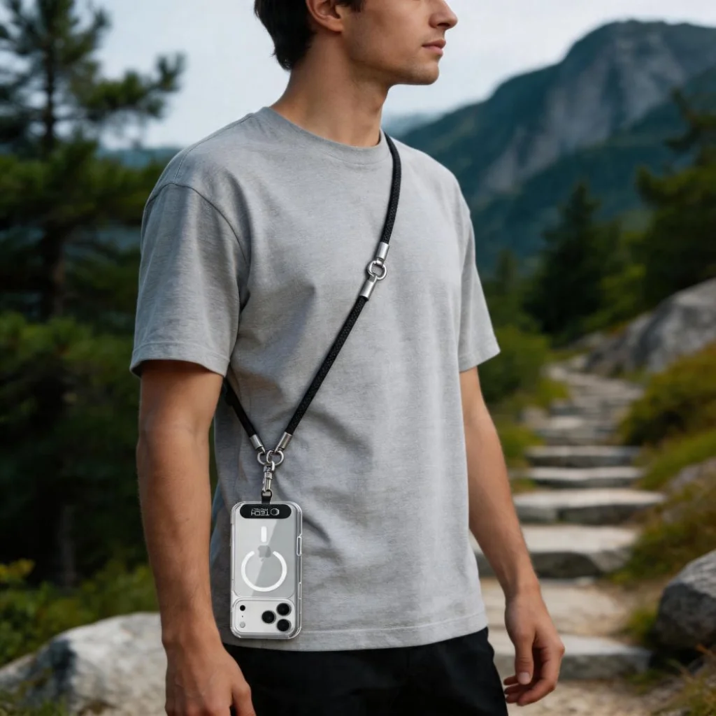 A mellékelt adapter a tok alá, a telefon és a tok közé csúsztatható, és rögzítési pontként szolgál mindkét pánt karabinerei számára. Ennek köszönhetően a szett bármilyen okostelefonnal és bármilyen tokkal használható, ragasztás és a készülék módosítása nélkül. Elég a helyzetnek megfelelően kiválasztani a megfelelő pántot – a hosszú crossbody pántot városi használathoz, a rövid csuklópántot pedig aktívabb mozgás közben.