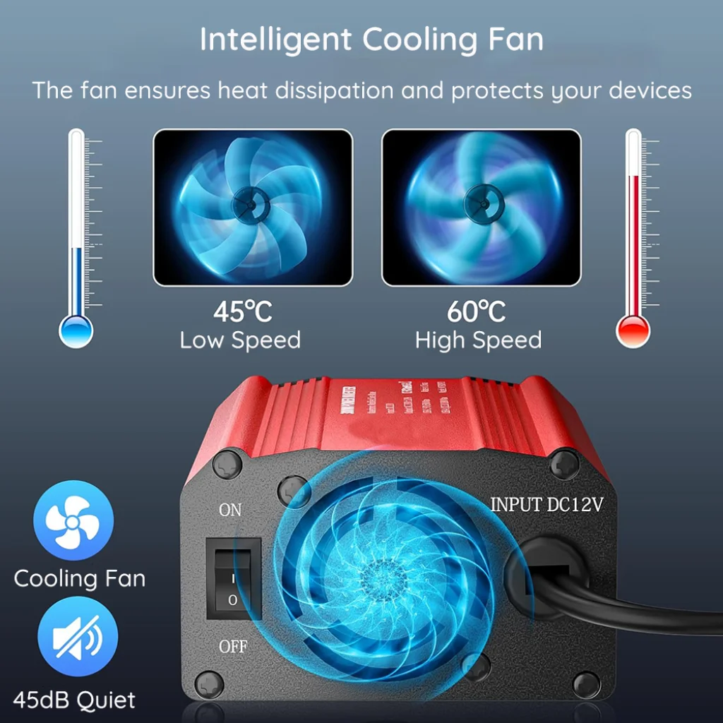 Az inverter beépített intelligens hűtőventilátorral rendelkezik, amely automatikusan szabályozza a fordulatszámát a belső hőmérséklet függvényében. Alacsonyabb hőmérsékleten (kb. 45°C) alacsony sebességgel, magasabb hőmérsékleten (kb. 60°C) pedig magasabb sebességgel működik, biztosítva az optimális hőelvezetést. Ez a halk (max. 45dB) működés garantálja a készülék hosszú élettartamát és a zavartalan használatot, anélkül, hogy zavarná az utazás élményét.